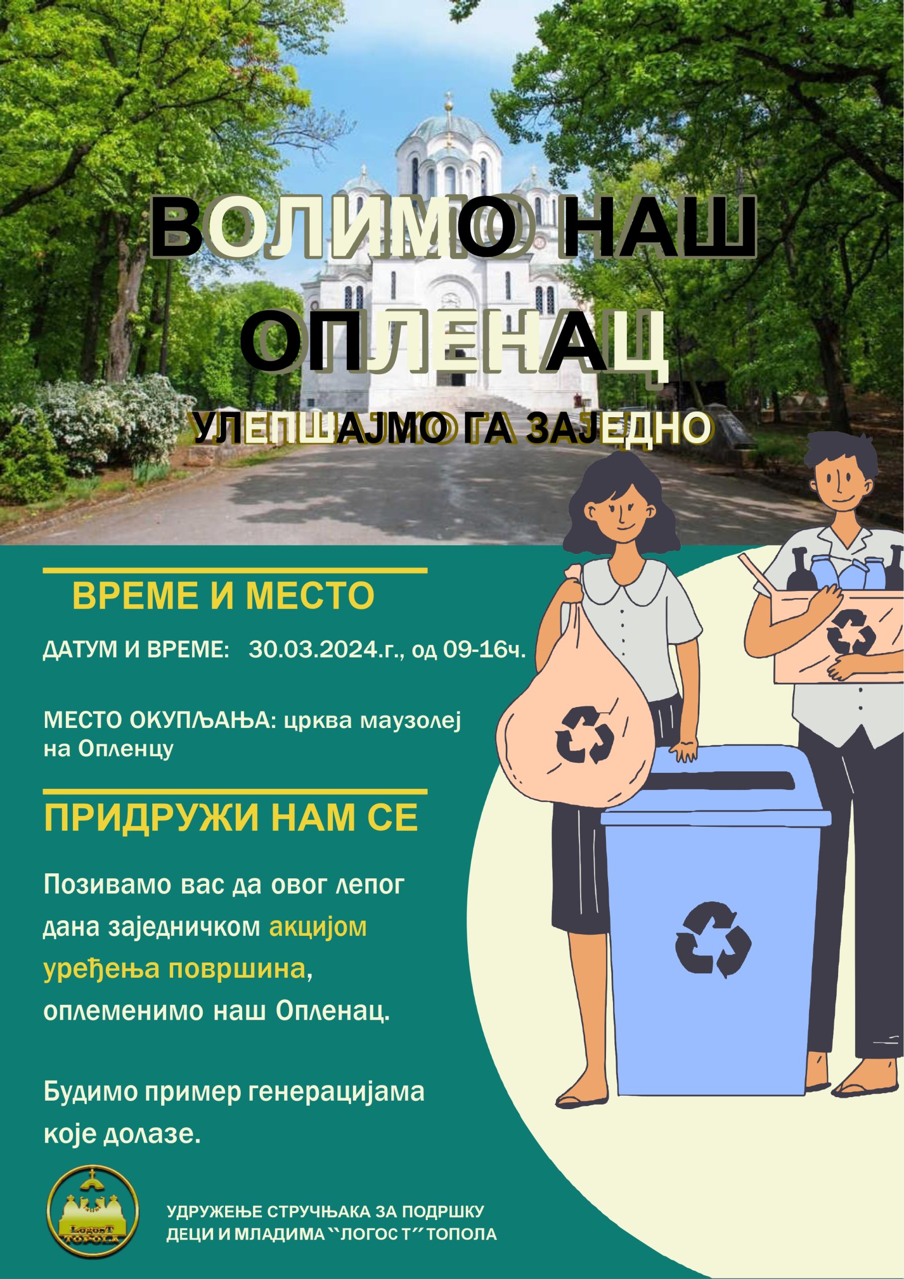 Udruženje stručnjaka za podršku deci i mladima „LOGOS T“ Topola, organizuje akciju uređenja površina na Oplencu. U planu je radna akcija na uređenju prostora oko bazena, snek-bara, iza Mauzoleja i površina oko staza za pešake.