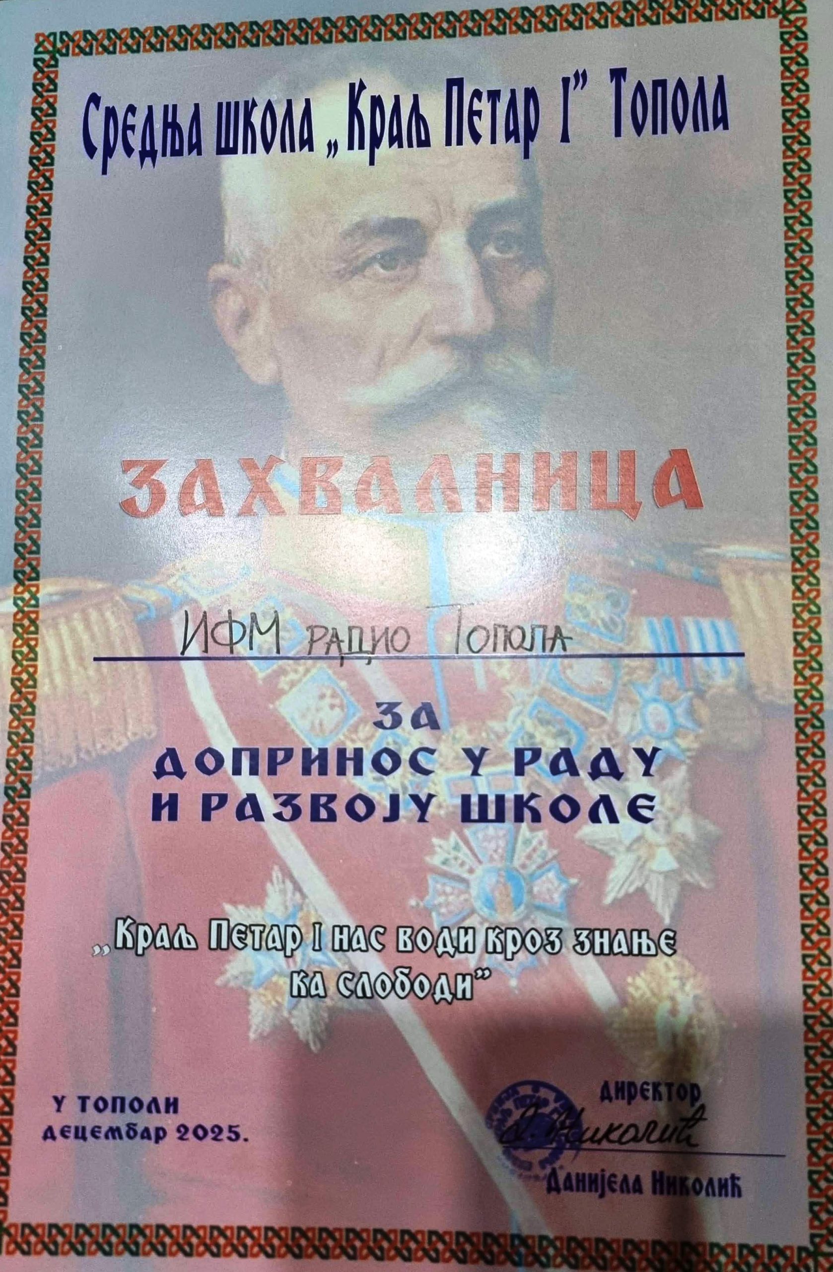 U sportskoj sali  srednje škole u Topoli danas, 13. decembra 2025. godine, svečanom akademijom obeleženo je 100 godina od početka rada Srednje škole u Topoli. Jubilej je obeležen u prisustvu učenika, nastavnika, bivših đaka, gostiju i zvanica, uz poruku snažno utkanu u slogan akademije: „Kralj Petar Prvi nas vodi kroz znanje ka slobodi“.